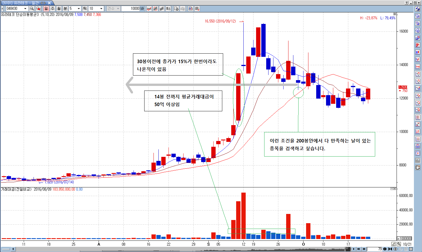 인데요 종가가 15% 이상인 날 하고 14봉전까지 평균거래대금 50억 이상이 빠진거 아닌가요?