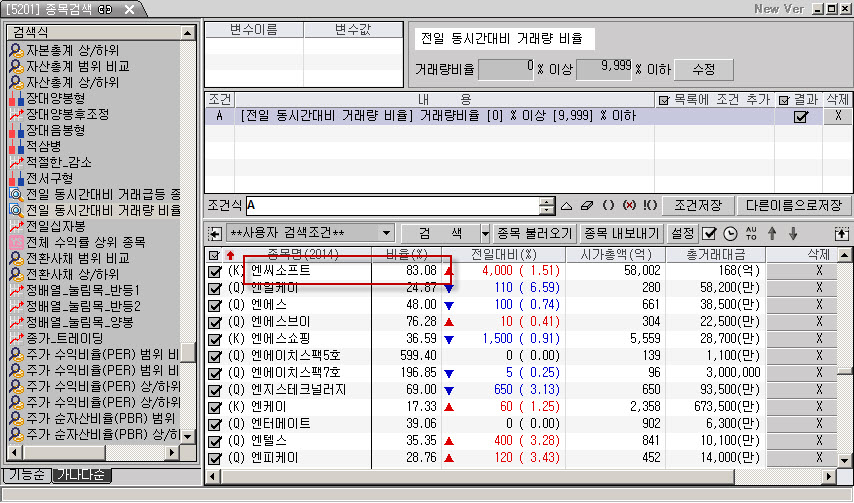 종목검색에 보면 기존 식 중에 [전일 동시간 대비 거래량 비율] 이 있는데