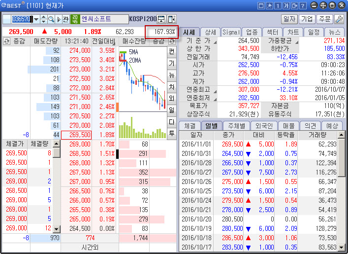 엔씨소프트036570의 전일 동시간 대비 거래량 비율은 167%입니다