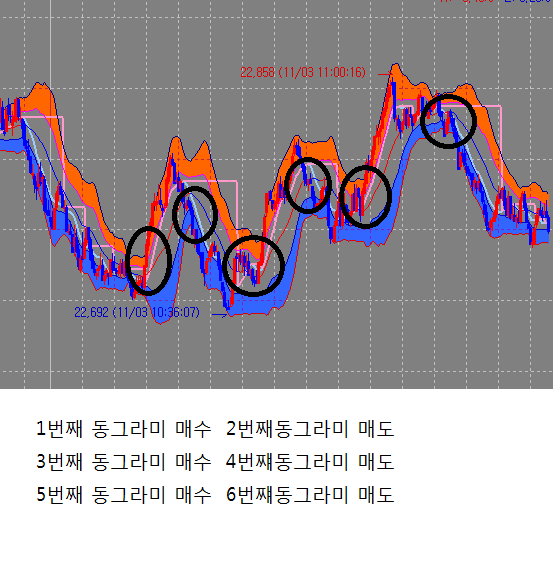 2. 위1번과 똑같지만 봉이 확실히 2가지선 밑에서 진행됬을경우 매수,매도 하나더 부탁드립니다