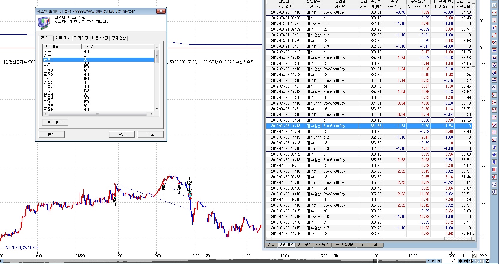 2019년 1월 28일 첫번째 진입의 손절(미니선물 50틱 ,1.00)이 적용되지 않고 end of day로 청산되었습니다.