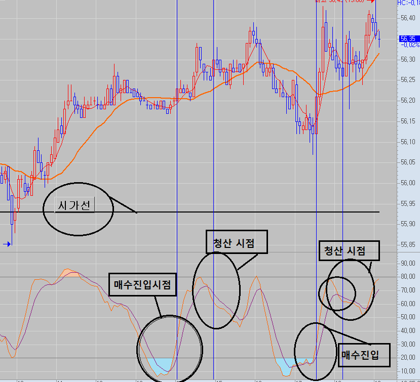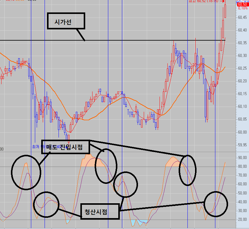 청산시점 %k 가 d 선을 골든 크로스 하면 청한 합니다