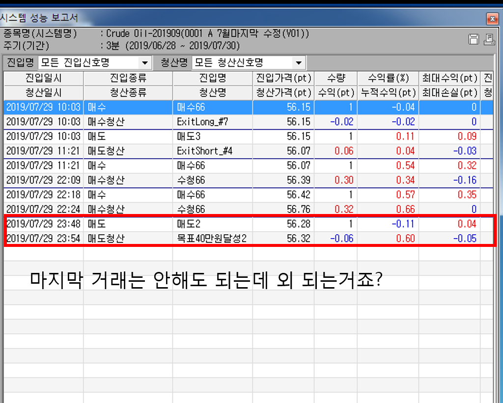 끝나면 40틱 이상인데 마지막 거래가 한번 더 매매가 되네요 ???