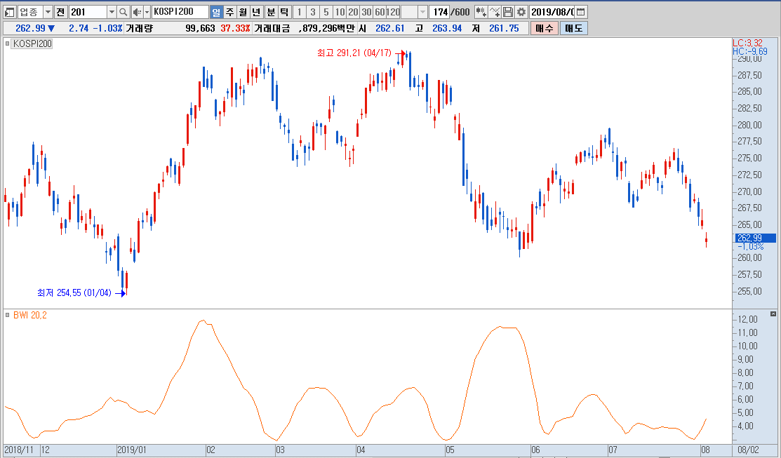 BWI의 값이 상대적으로 낮다는 것은 볼린저밴드의 가격대 폭이 상당폭 축소된 것이며 따라서 앞으로 추세변화의 가능성이 크다고 해석한다