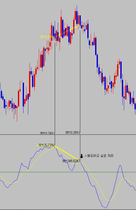 > macd 의 시그널(노란선)의 직전 1번째 고점이 직전 2번째 고점보다 낮고,