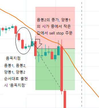 20ma 아래에서 음봉1, 음봉2, 양봉1, 양봉2가 순서대로 발생시 '음꼭지점' 이라고 하고, 음봉2의 종가와 양봉1의 시가 중에서 작은값은 진입가격으로 설정합니다.