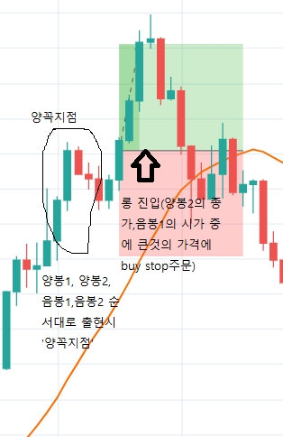 20ma 위에서 양봉1, 양봉2, 음봉1, 음봉2이 순서대로 발생시 '양꼭지점' 이라고 하고, 양봉2의 종가와 음봉1의 시가중에 큰 값을 진입가격으로 설정합니다.