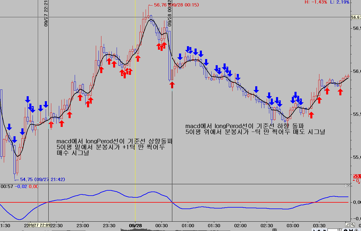 분봉기준 이동평균선 5 이평 밑에서 분봉 시가가 +1틱 시가 위로 찍을시 매수 시그널발생