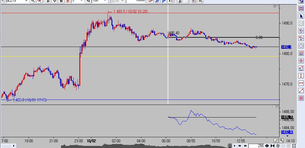 지표속성창의 차트표시탭에서 상은 빨간색, 하는 파란색, 중심은 검정색으로