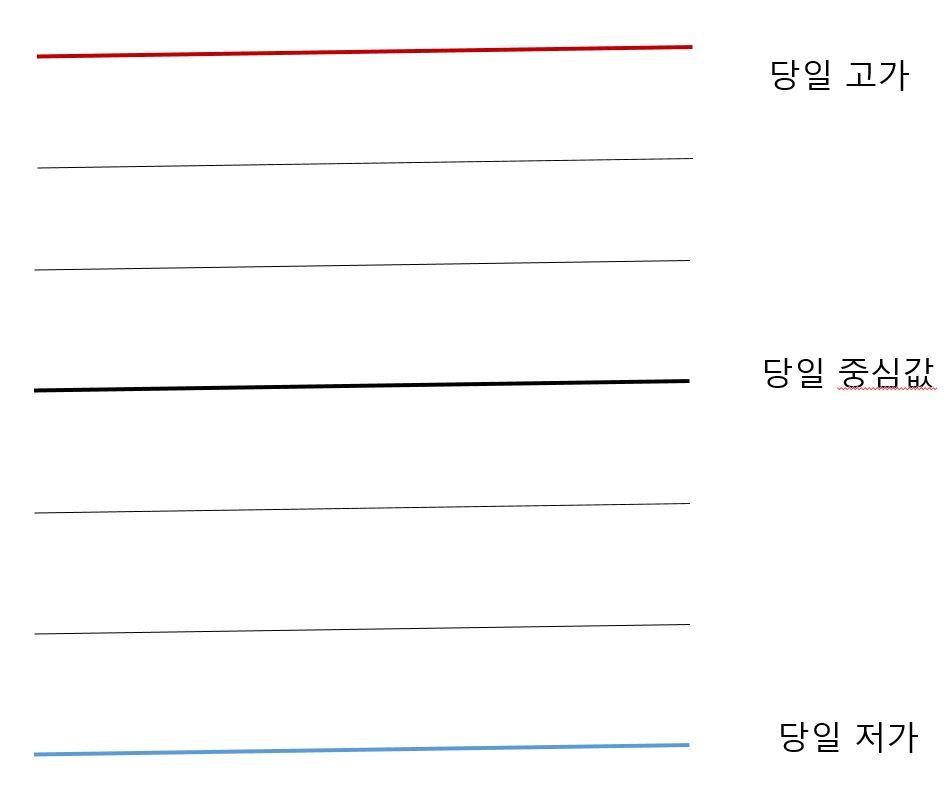 바쁜 업무에 노고가 많으십니다. 부탁드릴 사항은 아래와 같이 당일 시가 중심값 저가 를 포함한 총 7개의 선을 그리고 싶습니다(선간 간격을 동일하게). 각각의 선의 색과 굵기를 조정할 수 있도록 부탁 드립니다.