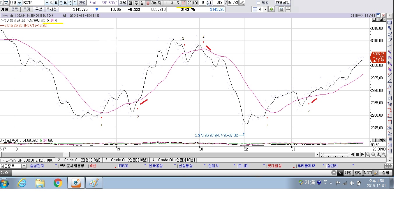 5분선34분선 골든신호 반복2회후 봉2개 완성시 34분선의 기울기가 우상향일때 매수신호후