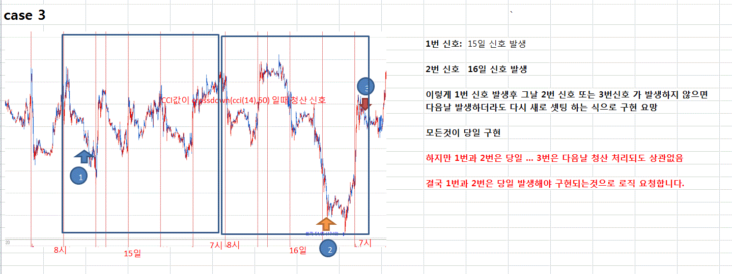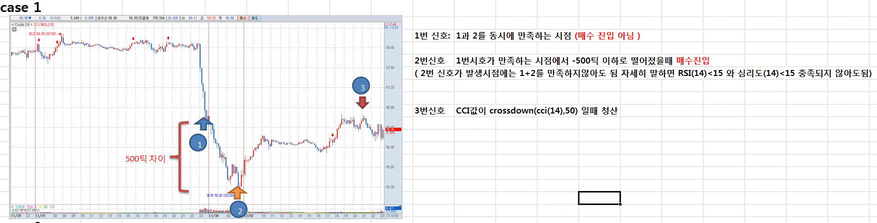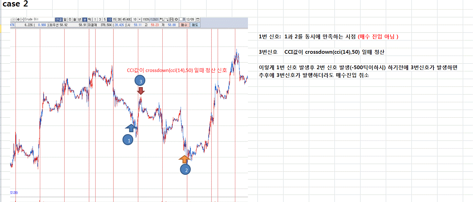 예를 들어 1과 2조건에 들었지만 -500틱이하로 되지 않아 매수진입이 되지않