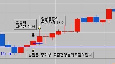 1. 종가상 음봉의 고점을 깨는 양봉이 나오면 다음봉 해당양봉의 중간값에서 매수