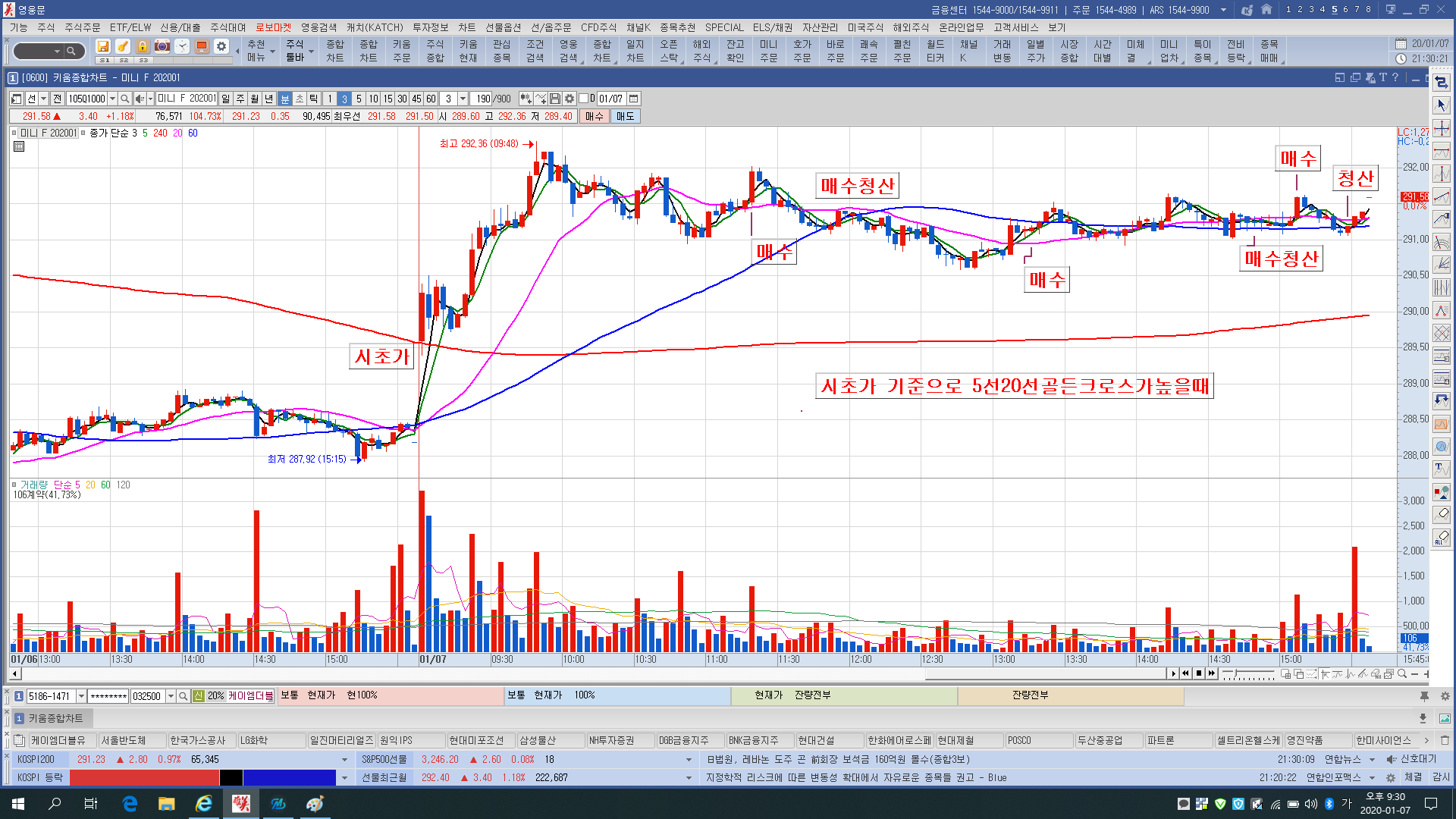 > 아침에 장 시작할 때 시초가 기준으로 시초가 보다 높을 때 가격으로만 5선 20선 골든크로스 매수 5선 20선 데드크로스 매수청산 하는 수식 부탁드립니다.