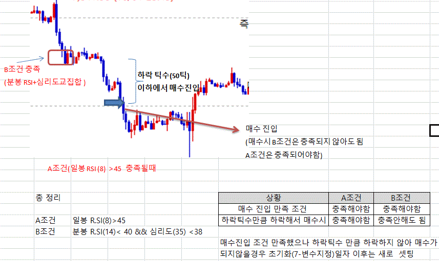 1. B조건((분봉 RSI(14)<40 & 심리도(35)<38)) 을 만족하나 A조건((일봉 RSI(8)>45))을 만족하지 않을 때 B조건이 충족되지 않는 상태가 되더라도 A조건이 만족되는 시점에 매수 진입함.
