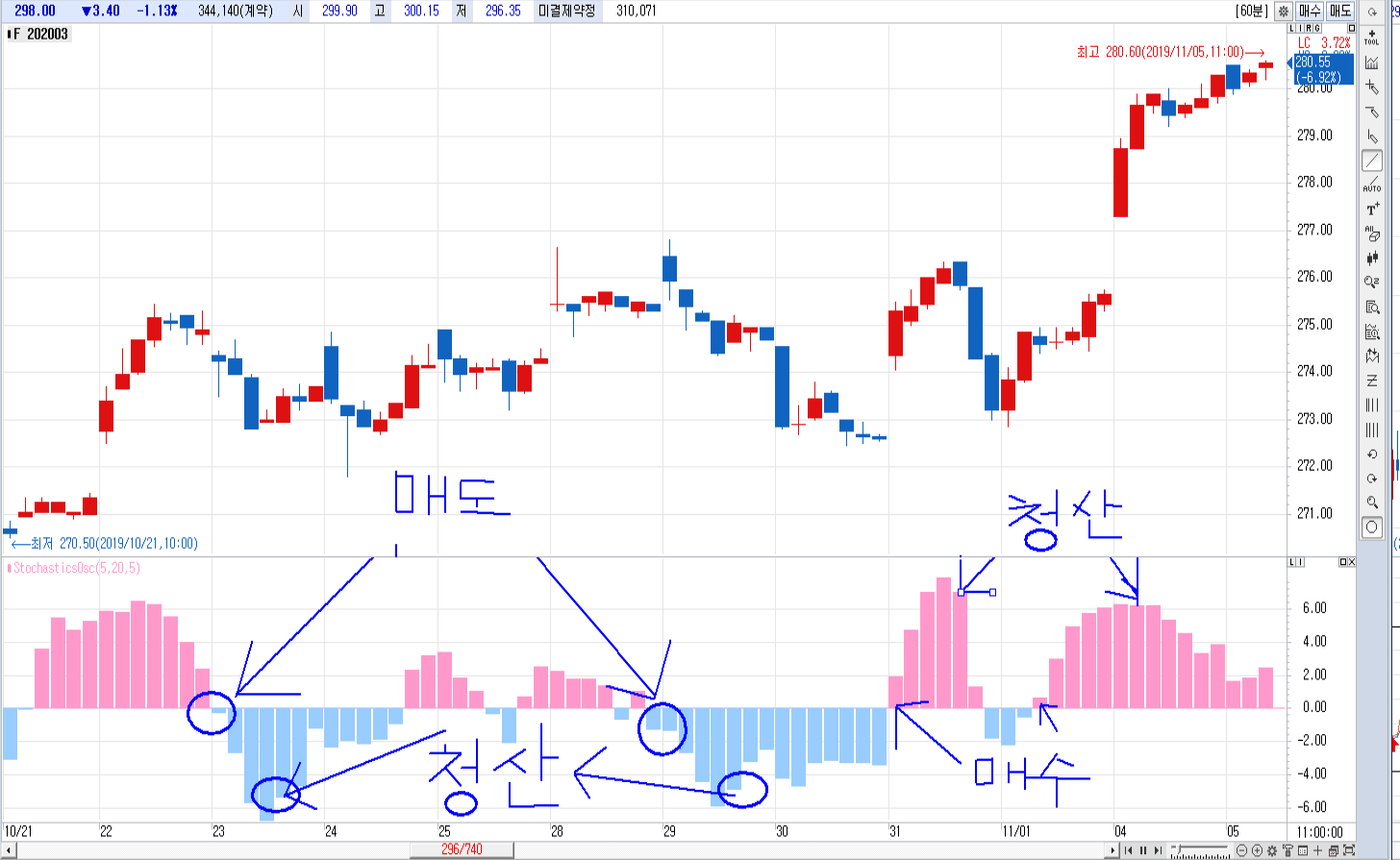 사진에 나오는 보조지표는 스토케스틱 오실레이터 5 20 5 설정한 것입니다.