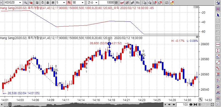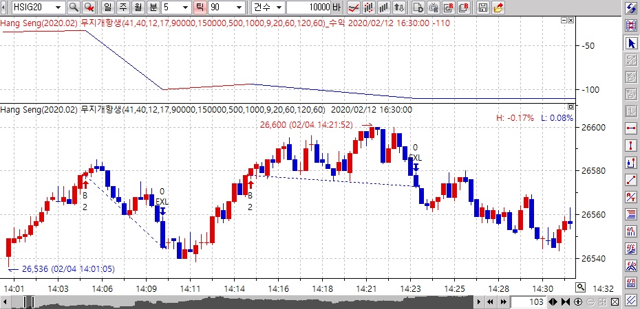 트레일링스탑에서 작동하는 부분이 틀려서 동일한시간에 1계약과 2계약 차트첨부합니다