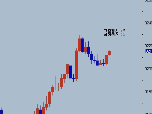 첨부그림에서 처럼 캔들 우측 여백 또는 현재 캔들 상단에 고점/저점 갱신건수를 카운트해서