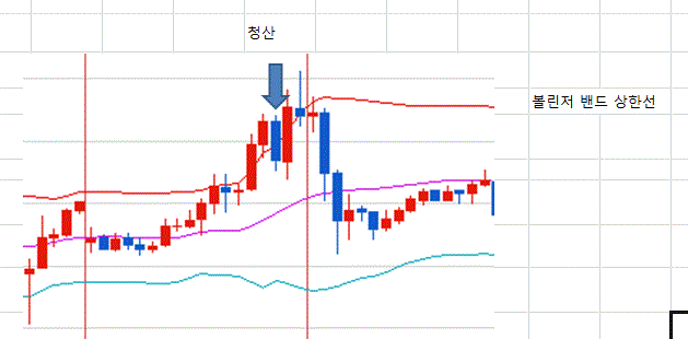 아래식에 추가로 볼린저밴드의 현재봉이 볼린저밴드 상한선을 돌파한후에 다시 상한선을