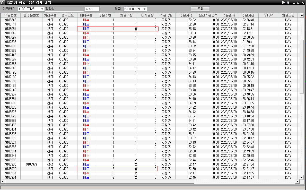 올려주신 그림에서 9185979번 주문은 미체결된것이 아닙니다.