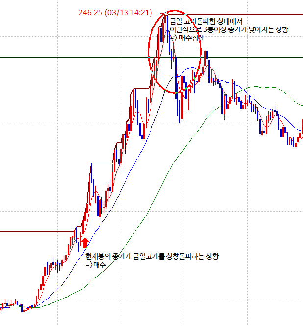 3. 금일고가를 돌파한 상태(매수주문이 들어간 상황)에서 3봉이상 종가가 낮아지면 매수청산(첨부1 참조)