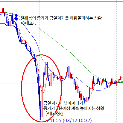 2. 현재봉의 종가가 금일저가를 하향돌파하면 매도