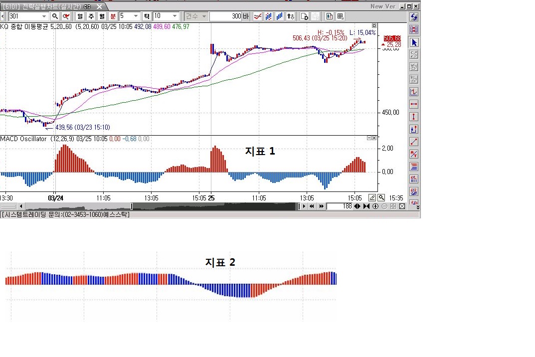 첨부 그림은 국내 선물 차트에 MACD Oscillator 지표입니다.