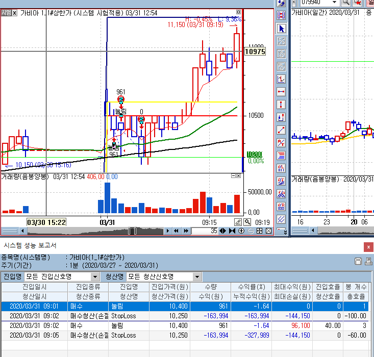 1분봉상 가비아 1분봉에 적용하여 두번의 매수진입과 손절이 발생하였습니다.