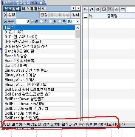 (이것도 수식관련 질문인지 정확히는 모르겠지만...) 완성한 수식을 넣고 종목 검색을 돌렸더니 다음 메세지가 나왔습니다. '서버과부하가 예상되어 검색 제한'