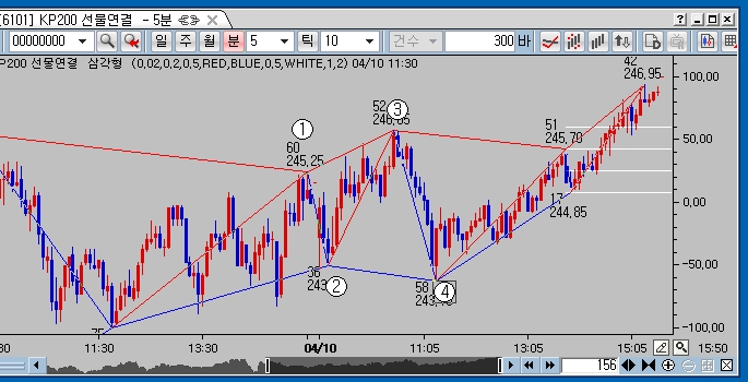 과끝나는 지점 수평선 중간선 총 3개선 ,이 3개수평선은 선물지수에 만 표시되고요 지표에는 추세선만 표시되게끔요 .그럼 수평선 오른쪽연장은 얼마 까지 하는냐 인데 봉3개 정도로만 해주세요.