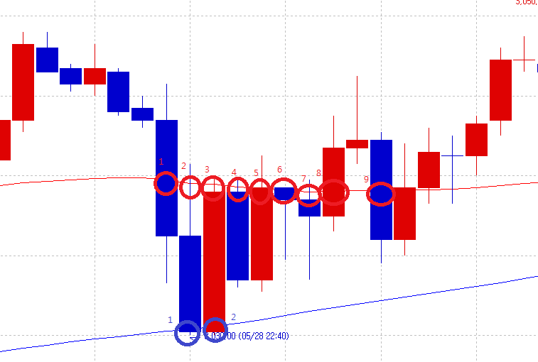 그리고 빨간색 동그라미 2번부터 8번까지는 지표수식에서 계속 알람이 울리지 않고 9번에서 다시 작동할 겁니다.