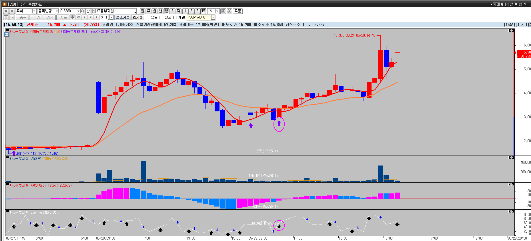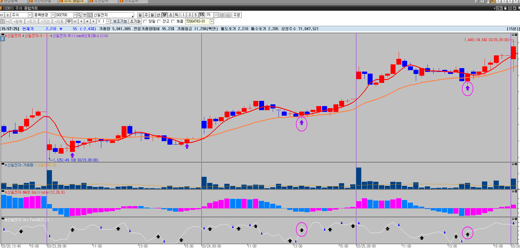 > 일봉이나, 분봉에서 스토캐스틱 페스트와 윌리엄R 신호가 동시 발생되는 종목을 찾고 싶습니다.