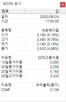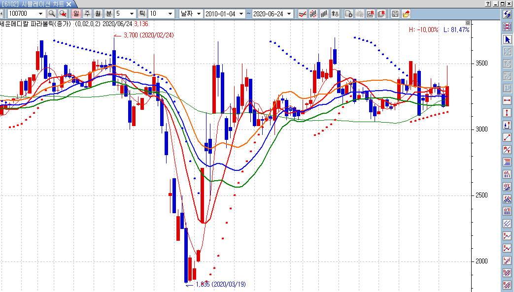 검색식에 value1이 종가보다 커야 한다고 조건을 넣었는데, 챠트상에 보면 종가보다 value가 낮습니다. 챠트에 적용된 지표는 파라볼릭(종가) 입니다.