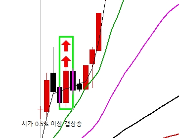 1. 분봉에서 시가(dayopen)는 전일 종가보다 0.5% 이상 갭상승이고 ( ma(c,3) , ma(c,10) 보다 높은 종가.