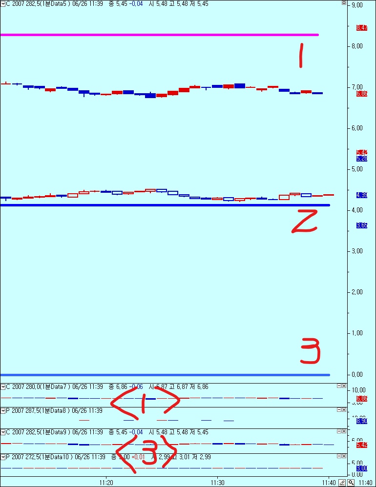 1, 위 그림 참조챠트의 <1>번에 해당되는 행사가 (즉, 콜280, 풋287)을 적용한것은 1, 2번선으로서 제대로 표시가 되는데요