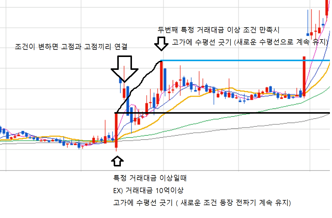 3) 임의의 고점 수평선에 역대칭되는 선을 하나 만들고 싶습니다.