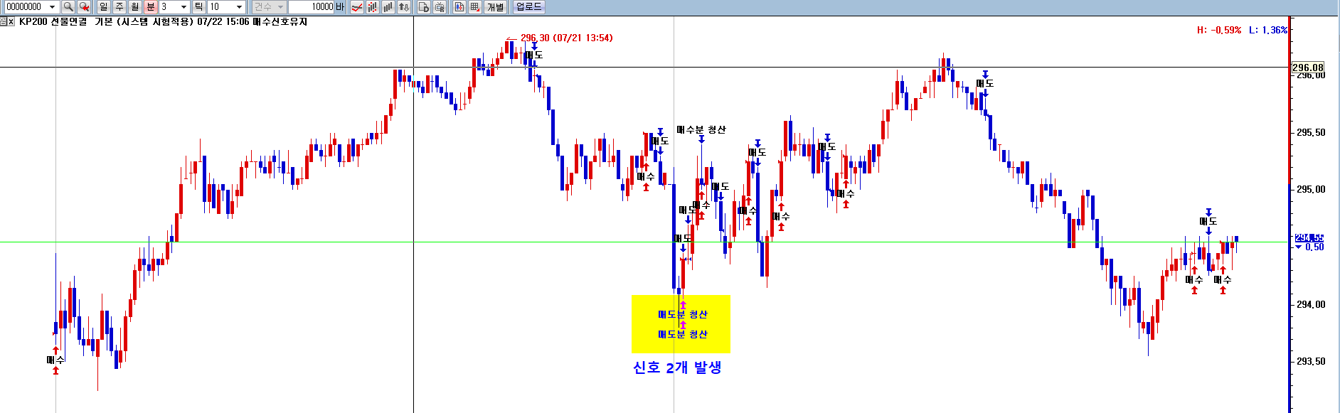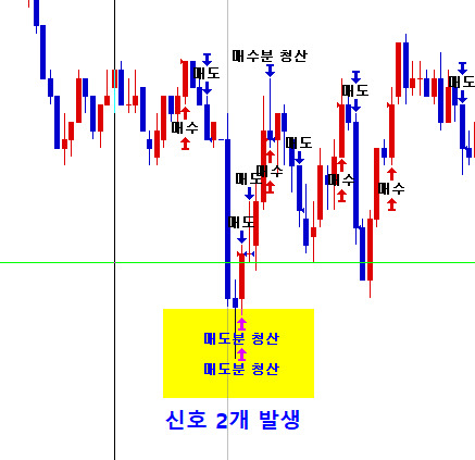 청산된 봉에서 진입조건이 동시에 만족하게 되어 발생하는 부분입니다.