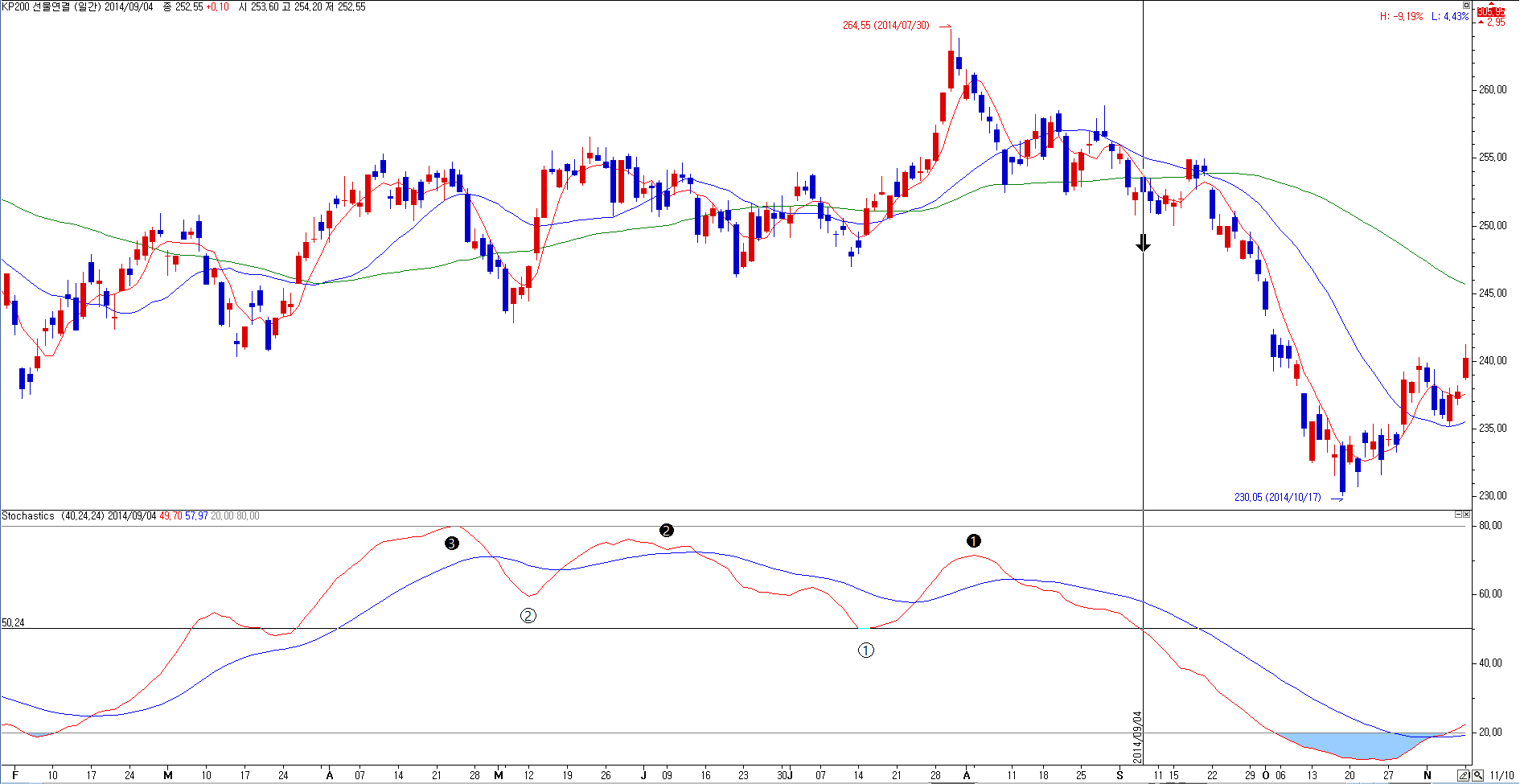 신호시점은 이전 스토 고점을 상승돌파할 때 상승신호이며