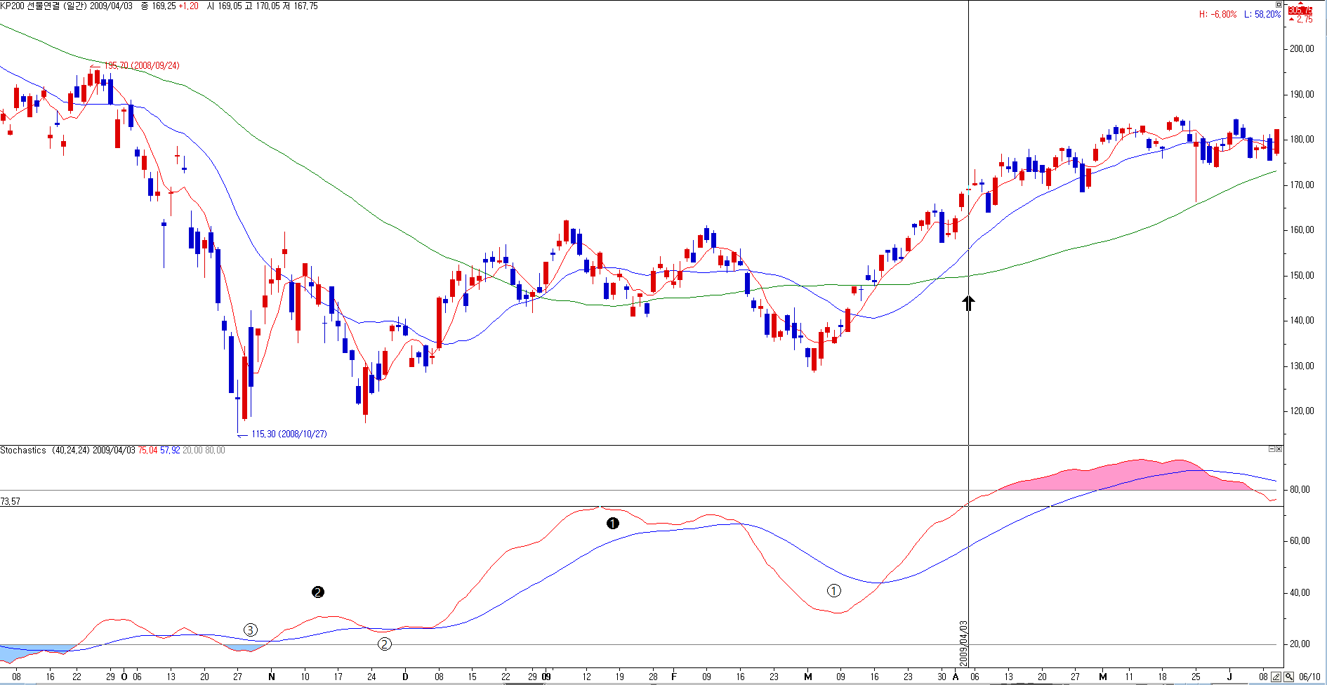 즉, 스토의 골짜기 최저점이 계속 높아지면서 봉우리의 최고점도 계속 높아지고 봉우리0의 스토K값이 봉우리1의 스토 K값 최고점을 넘어설때 상승신호입니다.