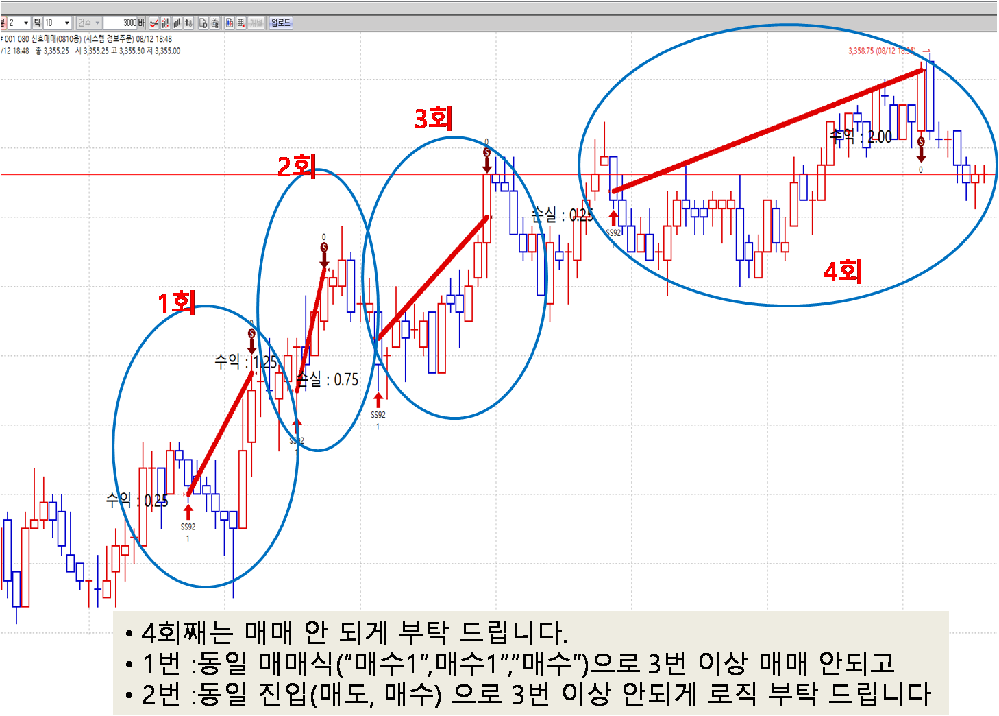 동일 이름 또는 연속 동일 진입(연속 매도, 매수 진입) 3번 이상 안되게 부탁 드립니다.