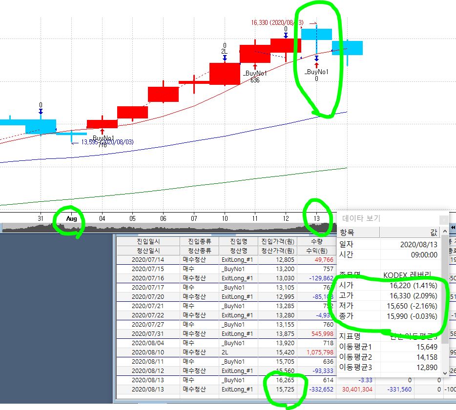 2) 종가에 매수나 청산 주문이 나가면, 매매리포트상엔 주문이 완료된 것으로 뜨지만, 실제로는 장종료로 인해 매수매도가 안되는 경우가 생기니 필요시 수작업으로 주문을 차트와 맞춰야 하는게 맞는 것이겠지요? onclose 경우엔 다음날 시가에 매매가 되고요~~