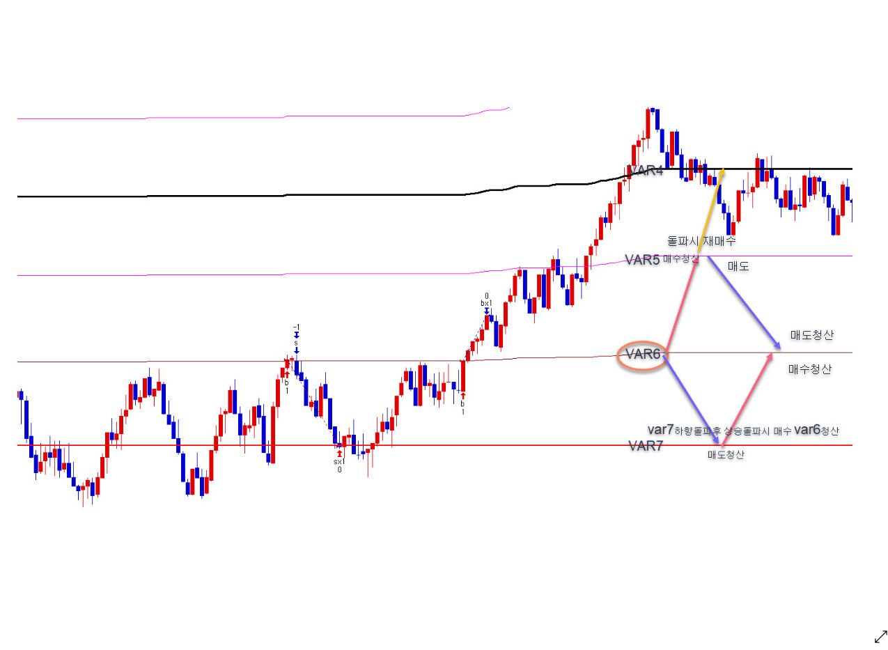 만약 var6에서 매수진입하였는데 va6을 하향돌파 봉완성하면 매수청산후 매도하여 var7청산하고. 다시 var7을 하향돌파하여 봉완성되면 다시 시장가매도하여 다음var8에서 시장가청산합니다.