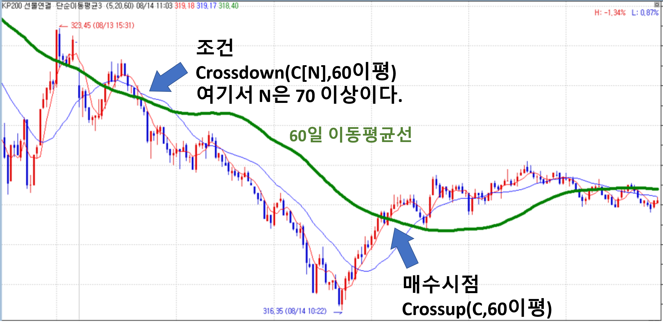 아래그림과 같이 60일 이동평균선을 crossup 하는 순간 매수를 하는식을 만들고 싶습니다.
