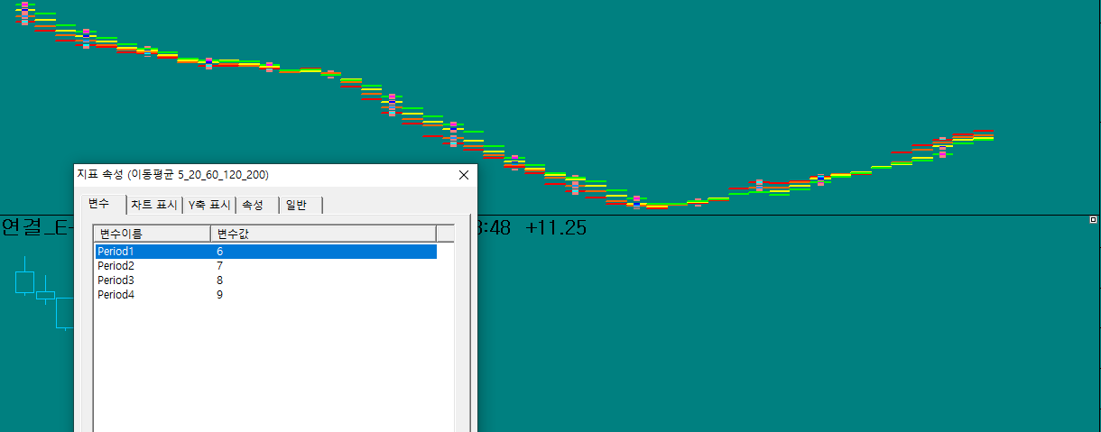 사진과 같이 이평선 변수 차이를 6 7 8 9 로 설정하면 서로 겹치는데
