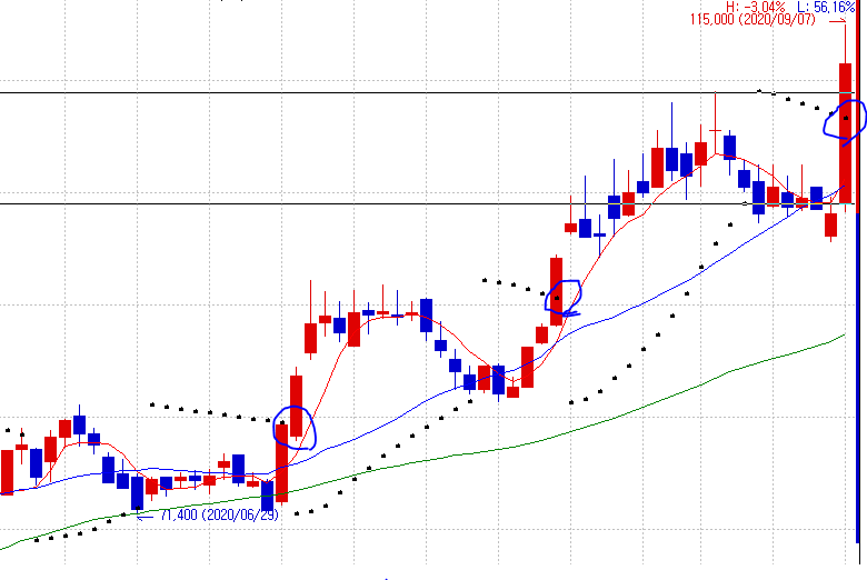검색시점에 파라볼릭 점을 돌파했다 다시 내려온 종목은