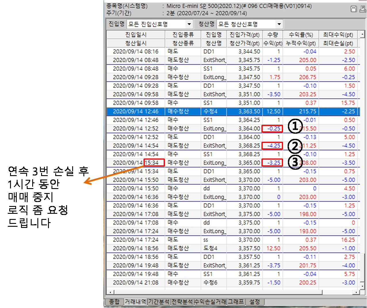 * 아래 수식은 2번째 매매 건너뛰지 말고 "1시간 동안 매매금지" 로 수정 좀 부탁 드립니다.
