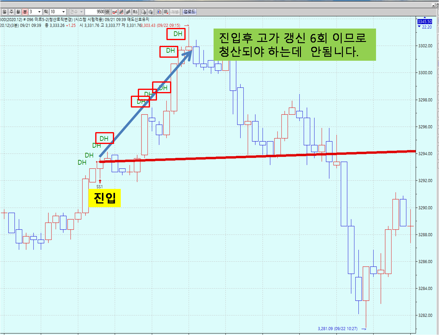 "매수 진입후 당일 고가가 6번 발생 하면 청산"
