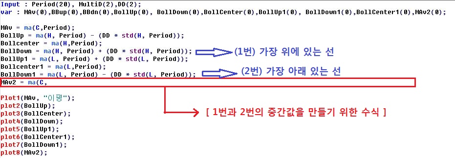 저가 기준의 상단, 하단, 중간선을 표시하는 수식을 다음과 같이 작성하였습니다만,