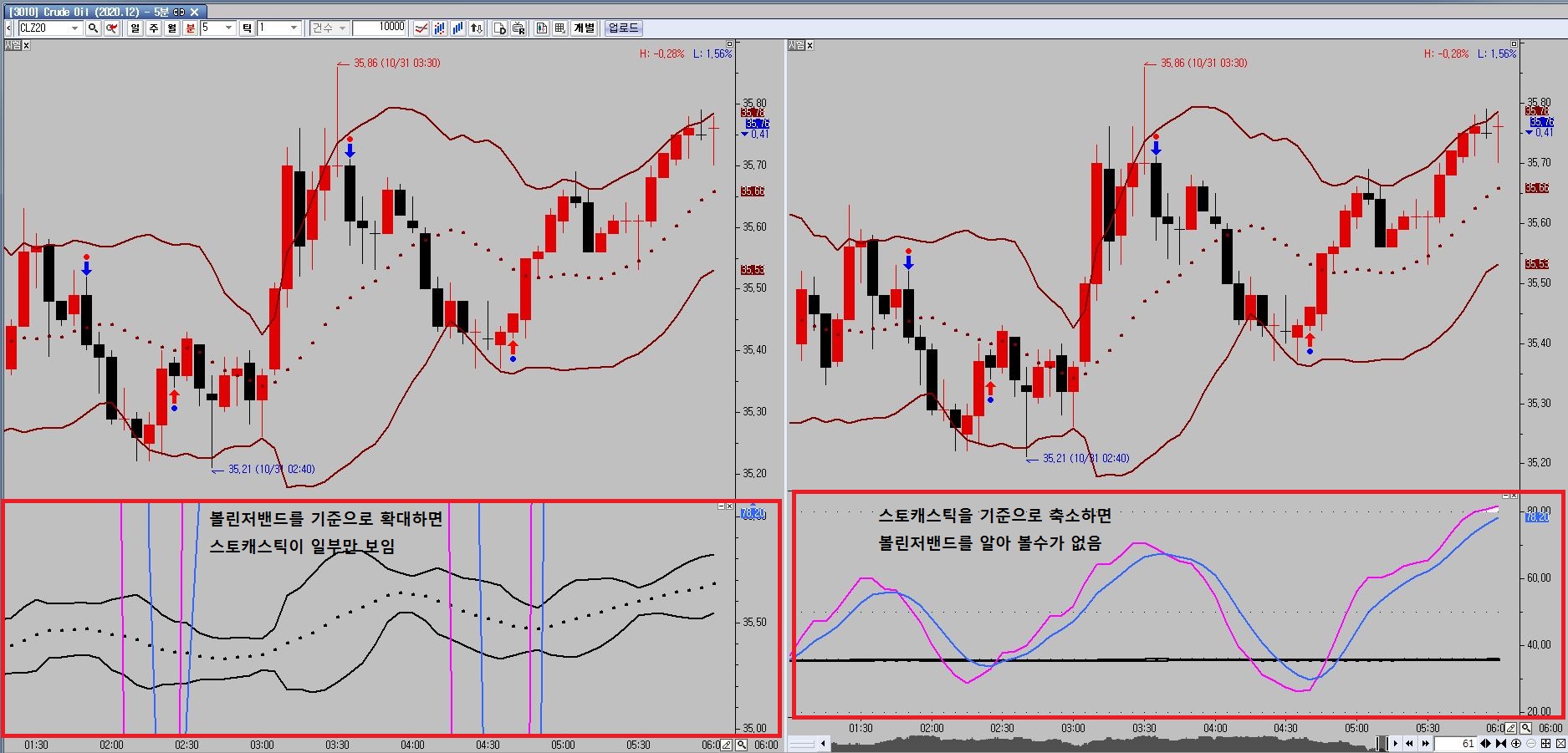 볼린저밴드를 기준으로 확대를 하면 스토캐스틱이 일부만 보이고,