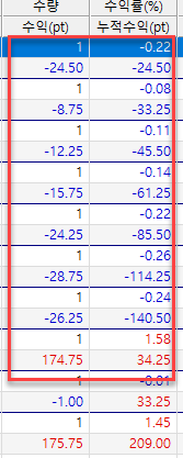 첨부된 파일에서 박스 친 부분의 마지막 익절 값이 수익이 175가 아니라 오른쪽에 있는 누적수익이 175가 되어야 하는데 익절될때 그부분이 안되는거 같습니다.